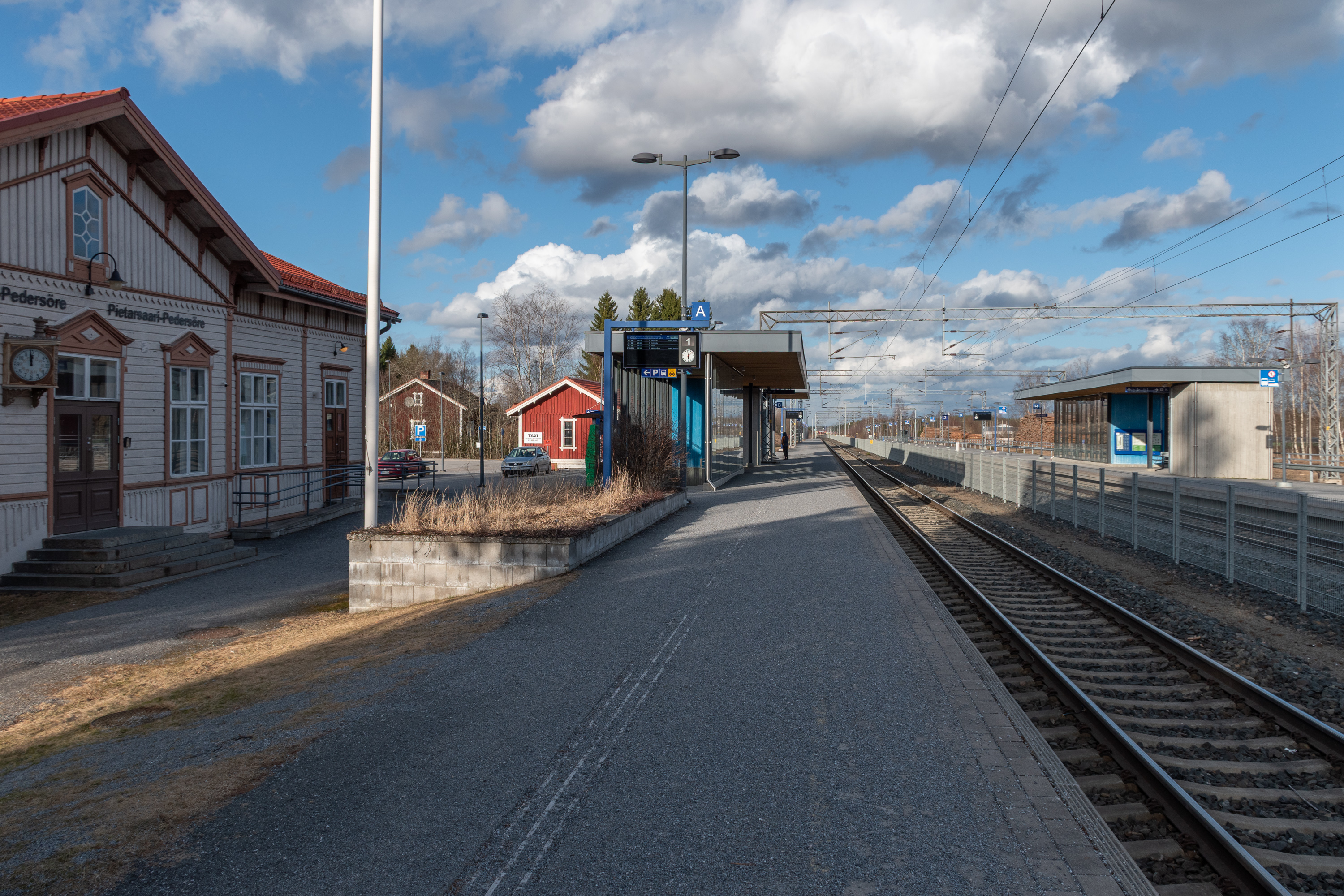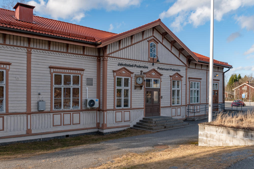 71. Ну и тут находится станция Якобстад-Педерсёре, которая, согласно названию, и служит основной станцией для всего города Якобстад. Потому что в город главный ход на Оулу не заходит, а ответвляется туда лишь от этой станции ветка длиной в 14 км. Ветка та построена почти одновременно с главным ходом (в 1887, а эта станция открыта в 1885), но пассажирское движение там закрыто было еще аж в 1956, и с тех пор отсюда людей возят автобусами.