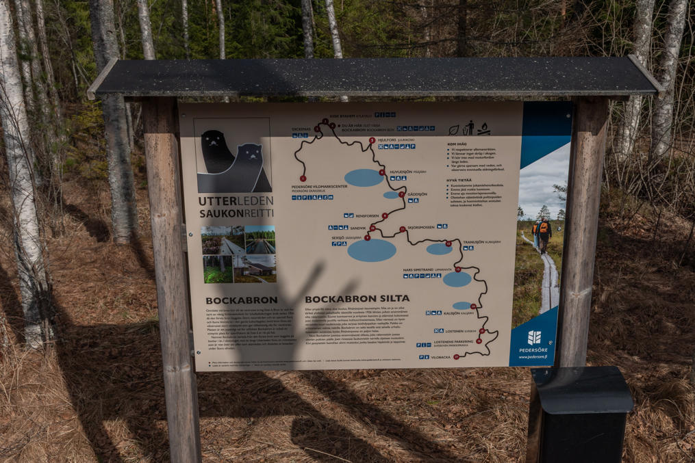 34. Тропа Поэтов через него не ведет, зато ведет главный пеший маршрут Педерсёре, маршрут Выдры (Utterleden, фин. Saukonreitti), длиной около 50 км. Судя по карте, маршрут проходит через достаточно много красивых и/или относительно нетронутых мест, так что по меркам довольно обжитой и не славящейся особо драматичной природой Остроботнии вполне приличный маршрут должен быть. Не кольцевой, конечно, — начинается с лыжной базы в Лаппфорсе, кончается в деревне Вилобака на реке Пурмо, соединяя таким образом долины Эссе и Пурмо; общественным транспортом чисто теоретически добраться между концами маршрута можно только с помощью школьных автобусов, которые по обеим долинам ходят в количестве двух пар в день, на Беннес и на Якобстад. Хотя можно еще, наверное, приехать на машине, прихватив с собой велосипед, оставить велосипед в одном конце маршрута, а машину в другом, и, пройдя маршрут, на велосипеде вернуться к машине, на велосипеде по дорогам будет километров 25 всего тут. (Я, как обычно, люблю прикидывать логистику таких походов, хотя едва ли сам когда-либо попробую.)