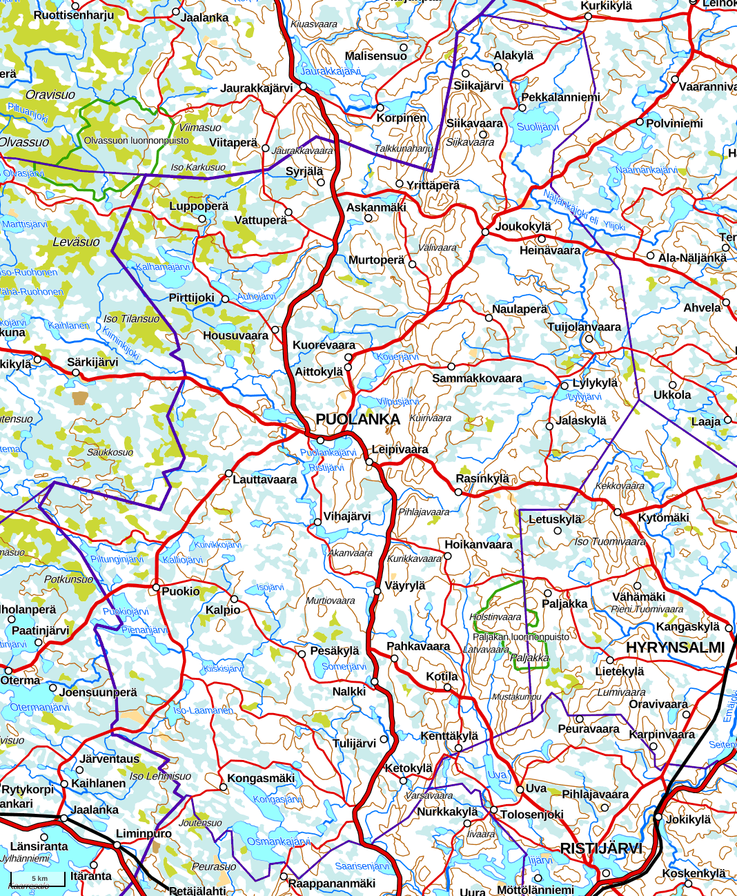 1. С юго-запада, с нашей стороны, в Пуоланку обычно попадают по трассе 800 — одной из бесконечных уютных маленьких региональных дорог. Цивилизация заканчивается после Ваалы, полей дальше на север почти нет и деревни редкие и совсем мелкие.