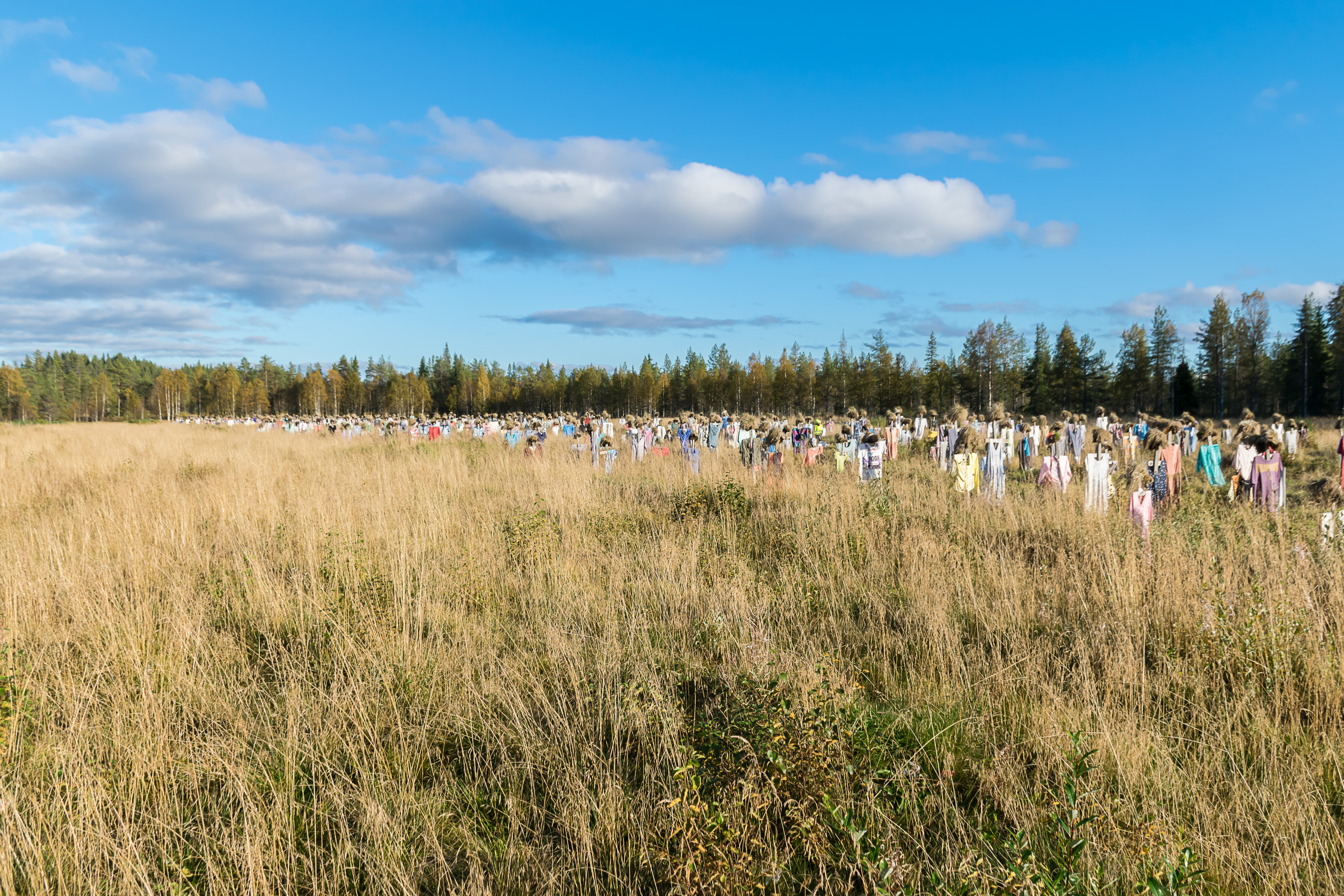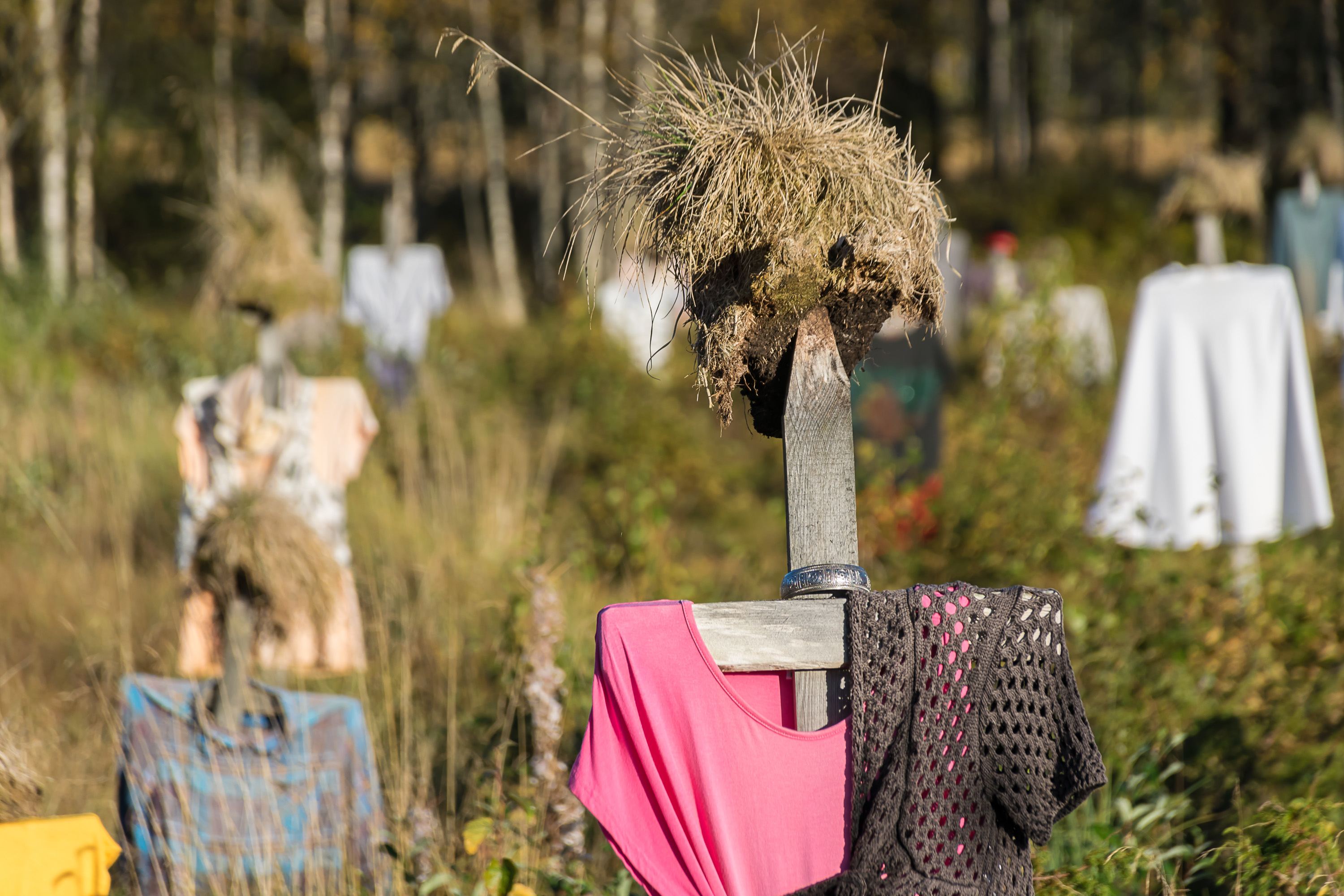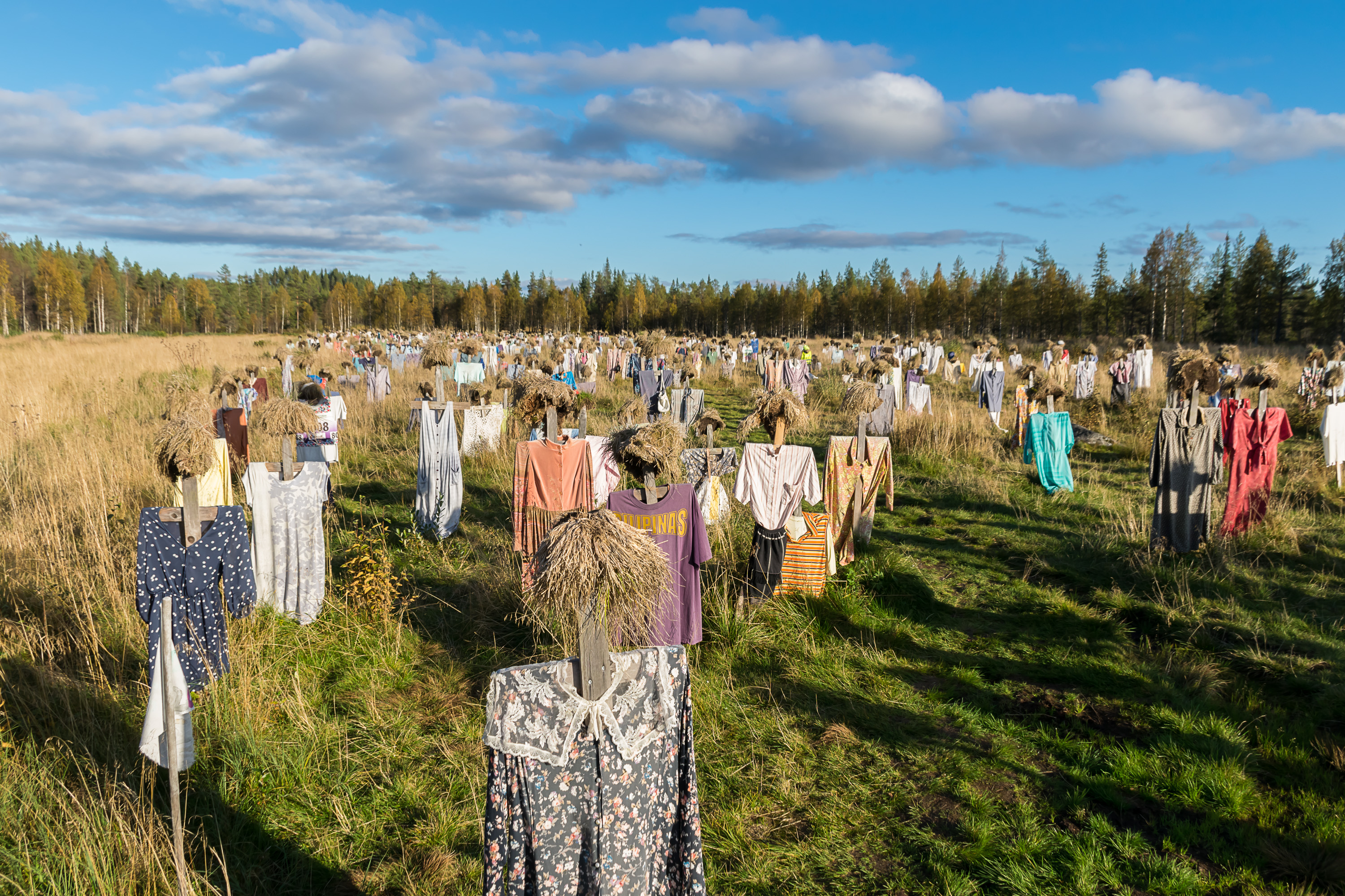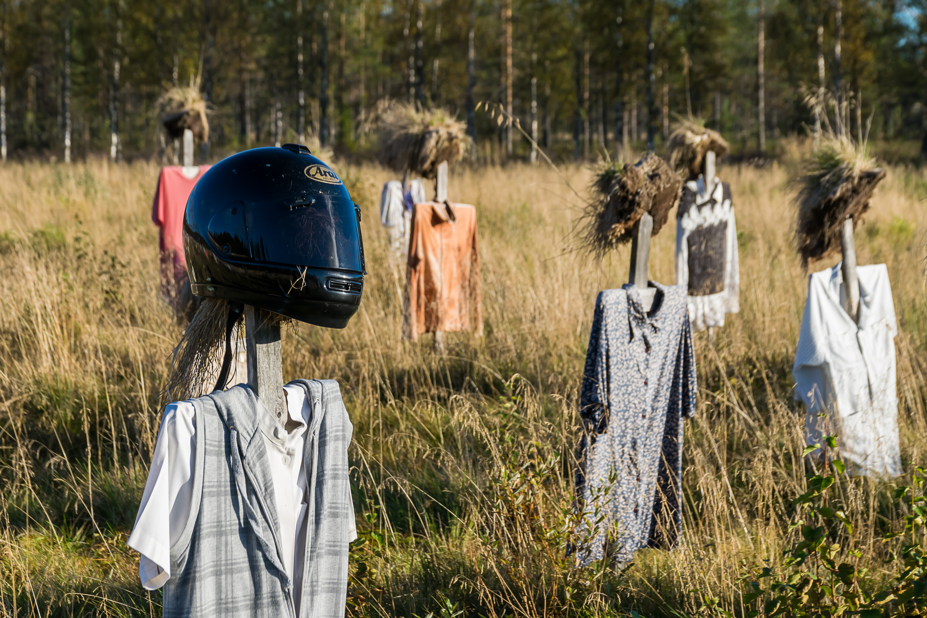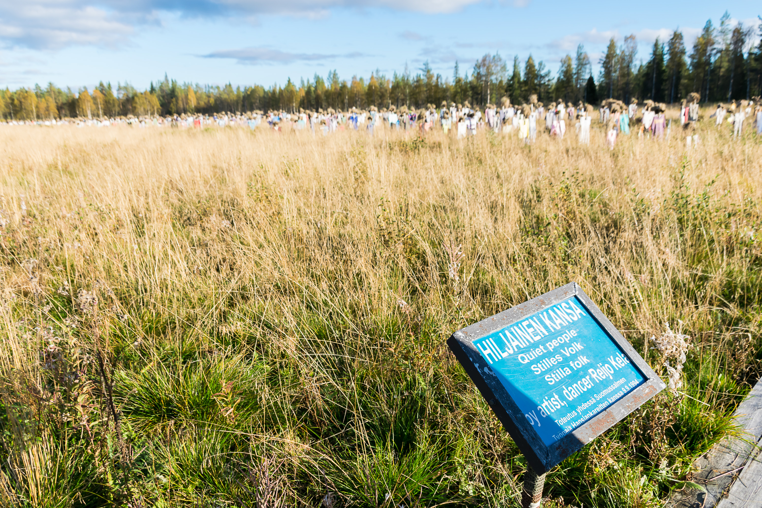 1. Наиболее посещаемая достопримечательность Суомуссалми — это, почти уверен, "Тихий народ" (Hiljainen kansa), произведение искусства 1994 года, созданное Рейо Келой (Reijo Kela, 1952-), местным танцором и деятелем перформанс-арта. Эта работа попросту стоит прямо у Национальной трассы 5, главной автодороги в этих местах, идущей на юг на Хюрюнсалми и Каяани (и дальше до самого Хельсинки), и на Куусамо на север; туристам, едущим на север в Куусамо или Восточную Лапландию (места, с точки зрения туризма куда более развитые, чем сам Суомуссалми), довольно сложно пропустить поле с пугалами. Всего таких пугал в поле стоит несколько сотен, одежда на ветру развевается, в общем, жутковато и запоминается.