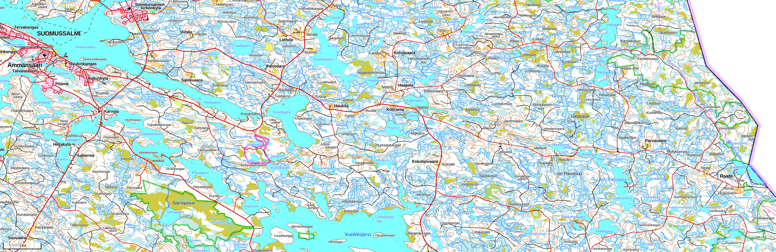 На финской стороне дорога шла в Суомуссалми, главное село волости/муниципалитета (раньше называвшееся Кианта, Kianta), а это село в свою очередь соединялась с остальной финской дорожной сетью, хотя в те времена она и была весьма неразвитой. В частности, на север шла дорога на Куусамо, на юго-запад — на Хюрюнсалми, и с обеих этих дорог можно было повернуть на запад в сторону Пуоланки, а через нее дальше на Оулу. Правда, Суомуссалми располагался на полуострове крупного озера под красивым названиеми Киантаярви (Kiantajärvi), и чтобы поехать что на Куусамо, что на Хюрюнсалми, нужна была паромная переправа; мосты через проливы Киантаярви довольно крупные и в те времена еще не были построены. Зимой, конечно, озеро замерзало, и по нему действовали ледовые дороги.